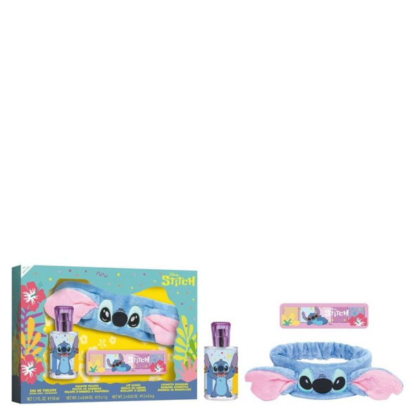 El Set Regalo Stitch contiene una fragancia de 50 ml con notas de caramelo y vainilla, una bandana y una paleta de sombras de ojos. Todo lo necesario para darle un toque fresco y divertido a tu día a día con estilo y comodidad.