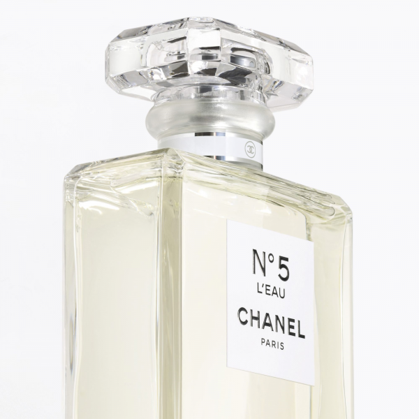 N°5 LEAU es el N°5 de hoy. Un floral abstracto vibrante con la modernidad por bandera y el frescor como leitmotiv. Nº5 LEAU, un elogio a la sencillez. Nº5 L'EAU, una apuesta segura que se refleja incluso en su packaging minimalista. Sobre la funda de cartón se dibuja en relieve la silueta icónica del perfume. En su interior, una segunda caja protege el frasco de una transparencia cristalina. Ningún elemento, ni del tapón ni del mecanismo, perturba esta imagen nítida. Como si la sencillez extrema del frasco se desvaneciese ante el contenido, para dejar paso a la imaginación de la mujer que elija este perfume.