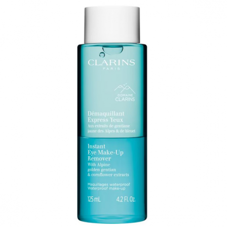 Este Desmaquillante Exprés para Ojos está dirigido a las mujeres que adoran el maquillaje intenso o resistente al agua y quieren cuidar sus ojos. Su fórmula bifásica sin efecto graso elimina el maquillaje resistente al agua con suavidad. Enriquecido con extracto de genciana amarilla bio de los Alpes recolectada en el corazón de la Hacienda Clarins y extracto de aciano bio para una piel del contorno de los ojos calmada.
