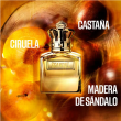 El escándalo comienza con notas amaderadas dulces de castaña y sándalo, culminando con el resplandor inesperado de la ciruela mirabel.