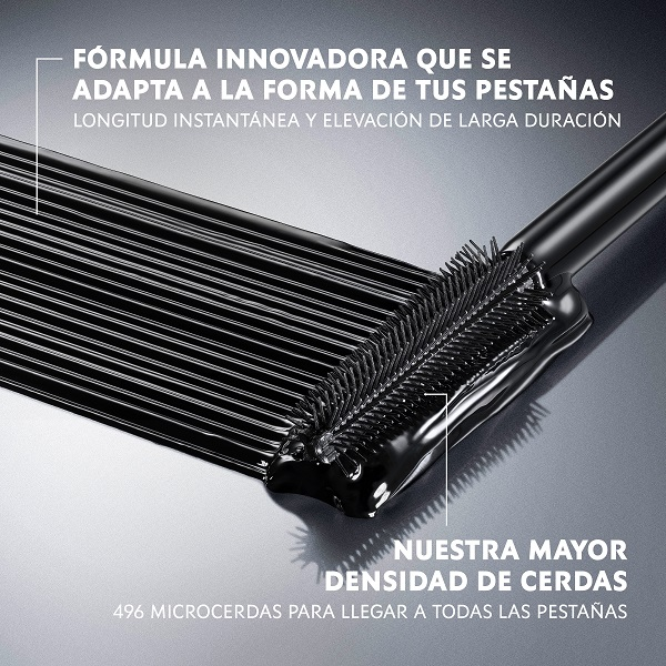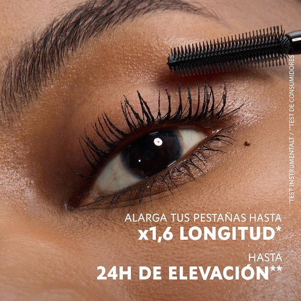 Aplica desde la base de las pestañas con movimientos en zigzag para alargar y levantar, luego aumenta el volumen con movimientos hacia arriba. Sostén en la base durante 3 segundos para fijar la elevación. Elimina con limpiador bifásico.