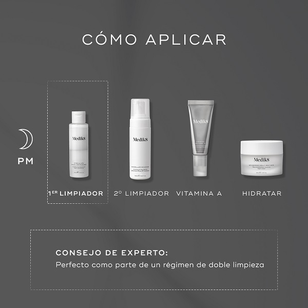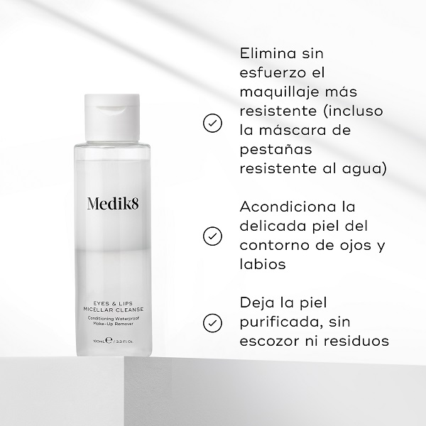 No deje nada atrás con Eyes & Lips Micellar Cleanse de Medik8. Un sistema micelar de limpieza de triple fase que elimina suavemente el labial y el maquillaje de ojos de larga duración sin necesidad de tirar de la piel. Disuelve sin esfuerzo la difícil máscara resistente al agua y colores de pigmentos en cuestión de segundos, el limpiador acondiciona e hidrata las pestañas y la piel, para dejar su cutis suave y purificada.